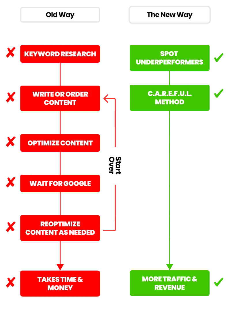 Leverage your most underutilized asset: Existing content that is not bringing in any traffic or revenue. Deploy the C.A.R.E.F.U.L.™ method to get the traffic you deserve from Google instead of taking the risk on new content.